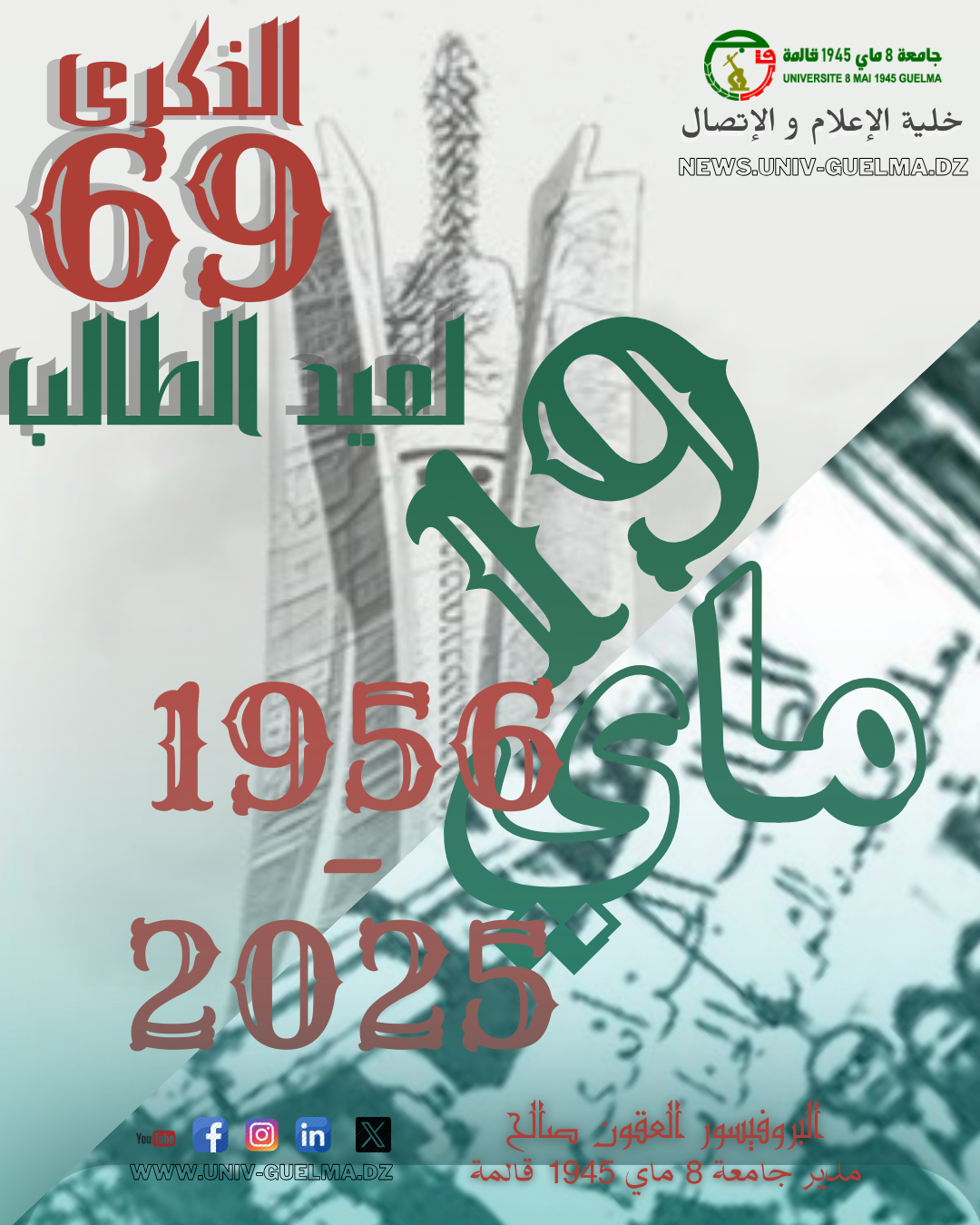 بهذه المناسبة، يسعدني أن أتقدم باسمي ونيابة عن أسرة جامعة 8 ماي 1945 قالمة بأحر التهاني وأطيب التمنيات