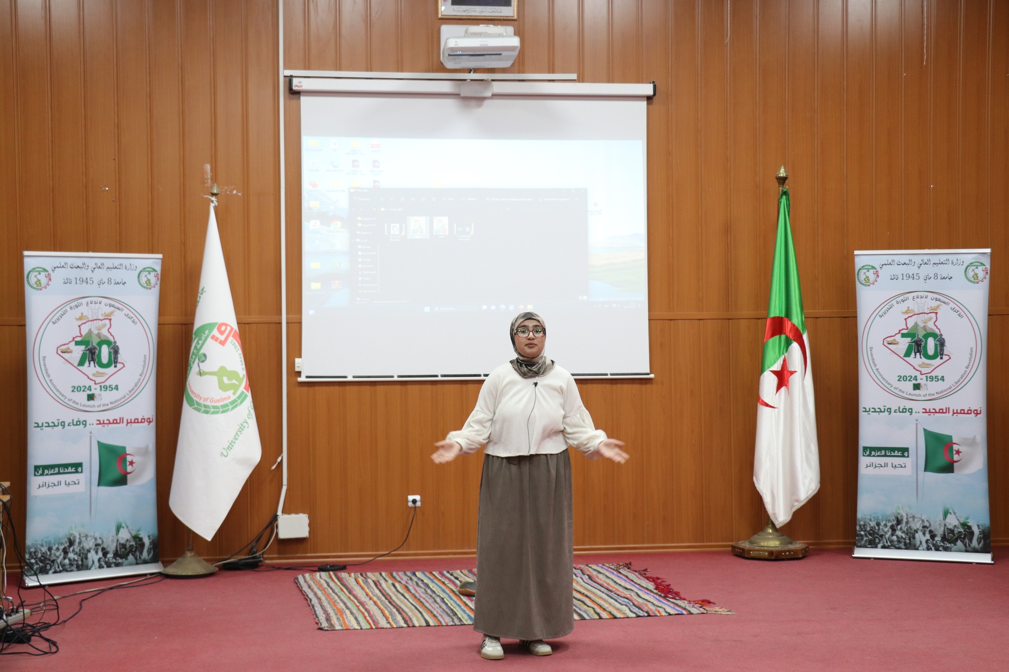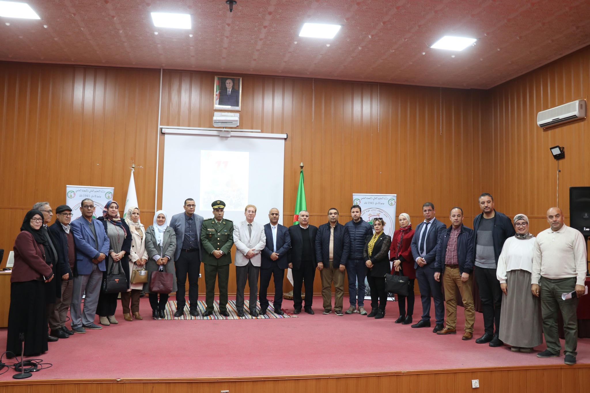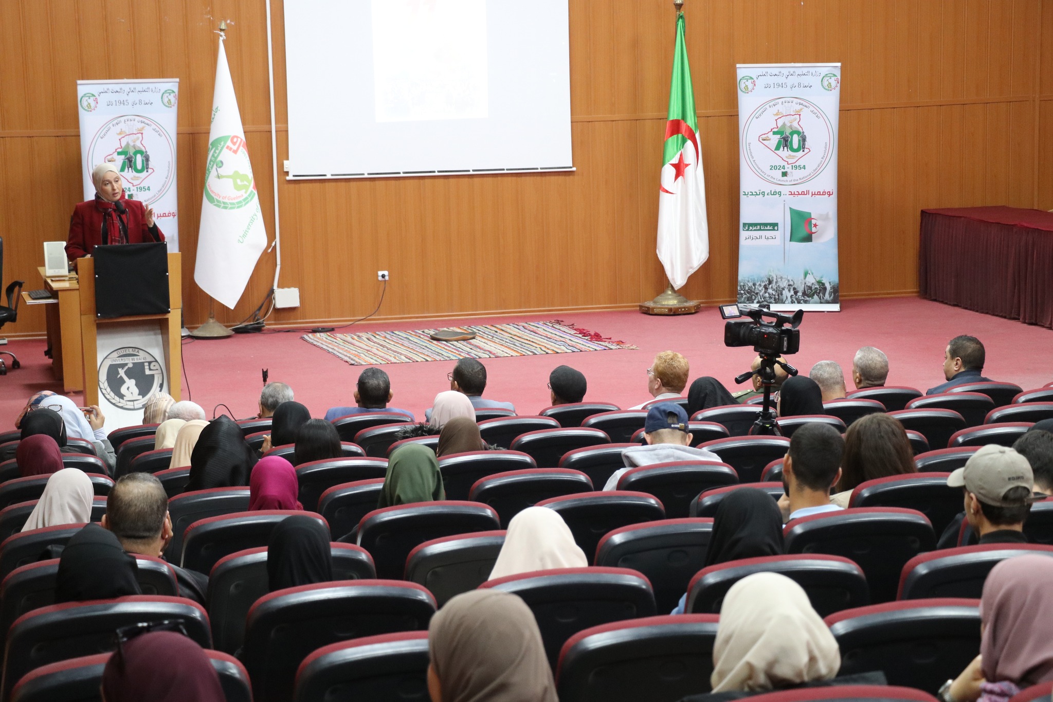 تواصل برنامج الفعالیة بقاعة المحاضرات بالمجمع القدیم ، بحضور ممثلين عن السلطات المدنیة والامنیة والعسکریة للولایة, ممثلي الأسرة الثوریة, الطاقم الإداري للجامعة, مدیر الخدمات الجامعية قالمة رفقة مدراء الإقامات.