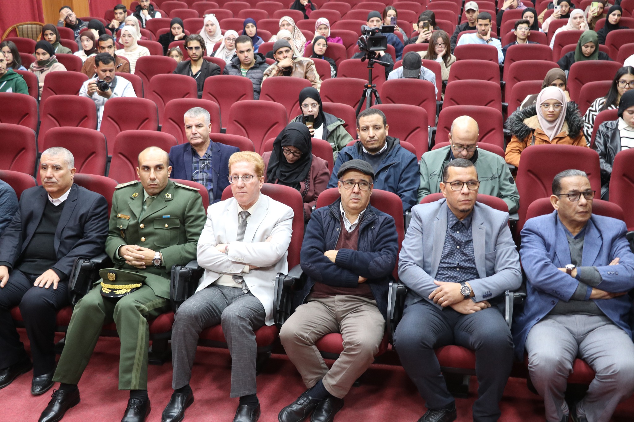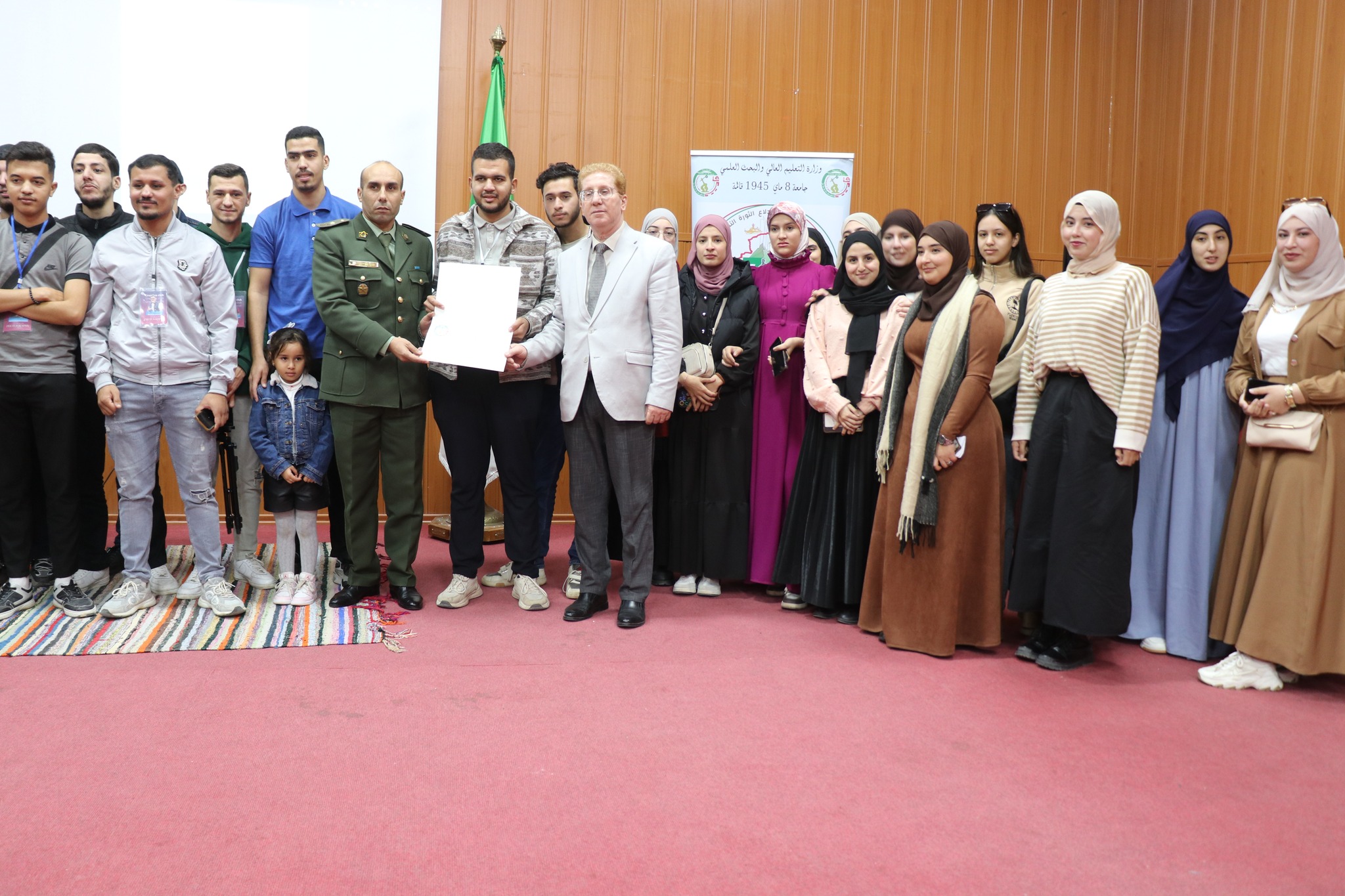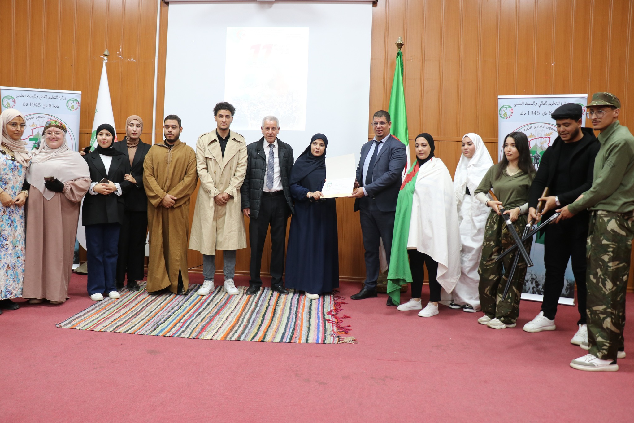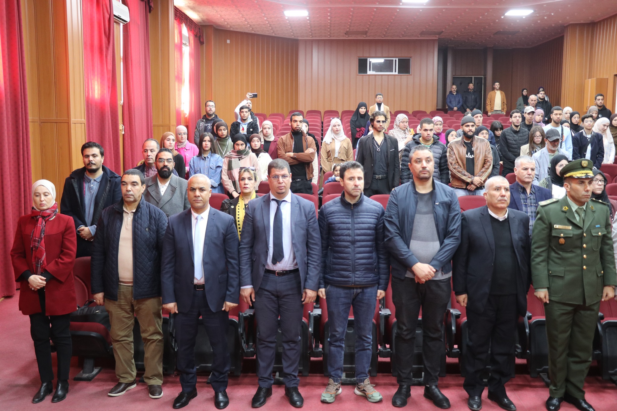 تواصل برنامج الفعالیة بقاعة المحاضرات بالمجمع القدیم ، بحضور ممثلين عن السلطات المدنیة والامنیة والعسکریة للولایة, ممثلي الأسرة الثوریة, الطاقم الإداري للجامعة, مدیر الخدمات الجامعية قالمة رفقة مدراء الإقامات.