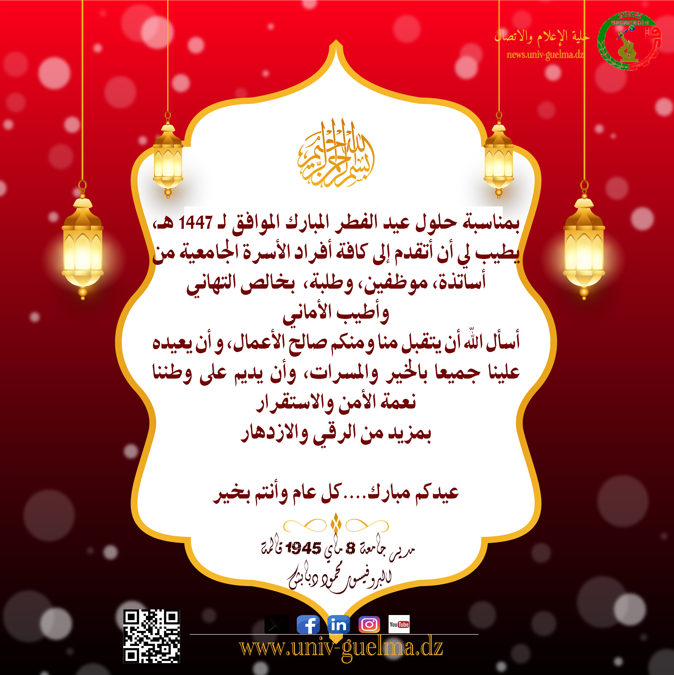 بمناسبة حلول عيد الفطر المبارك لعام 1447 هـ، وبالتزامن مع العطلة الربيعية، يسعدني أن أتقدم إلى كافة أفراد الأسرة الجامعية، من أساتذة وموظفين وطلبة، بأسمى آيات التهاني وأطيب التبريكات، راجيًا من الله العلي القدير أن يتقبل منا ومنكم صالح الأعمال، وأن يعيده علينا وعليكم بالخير واليُمن والبركات.