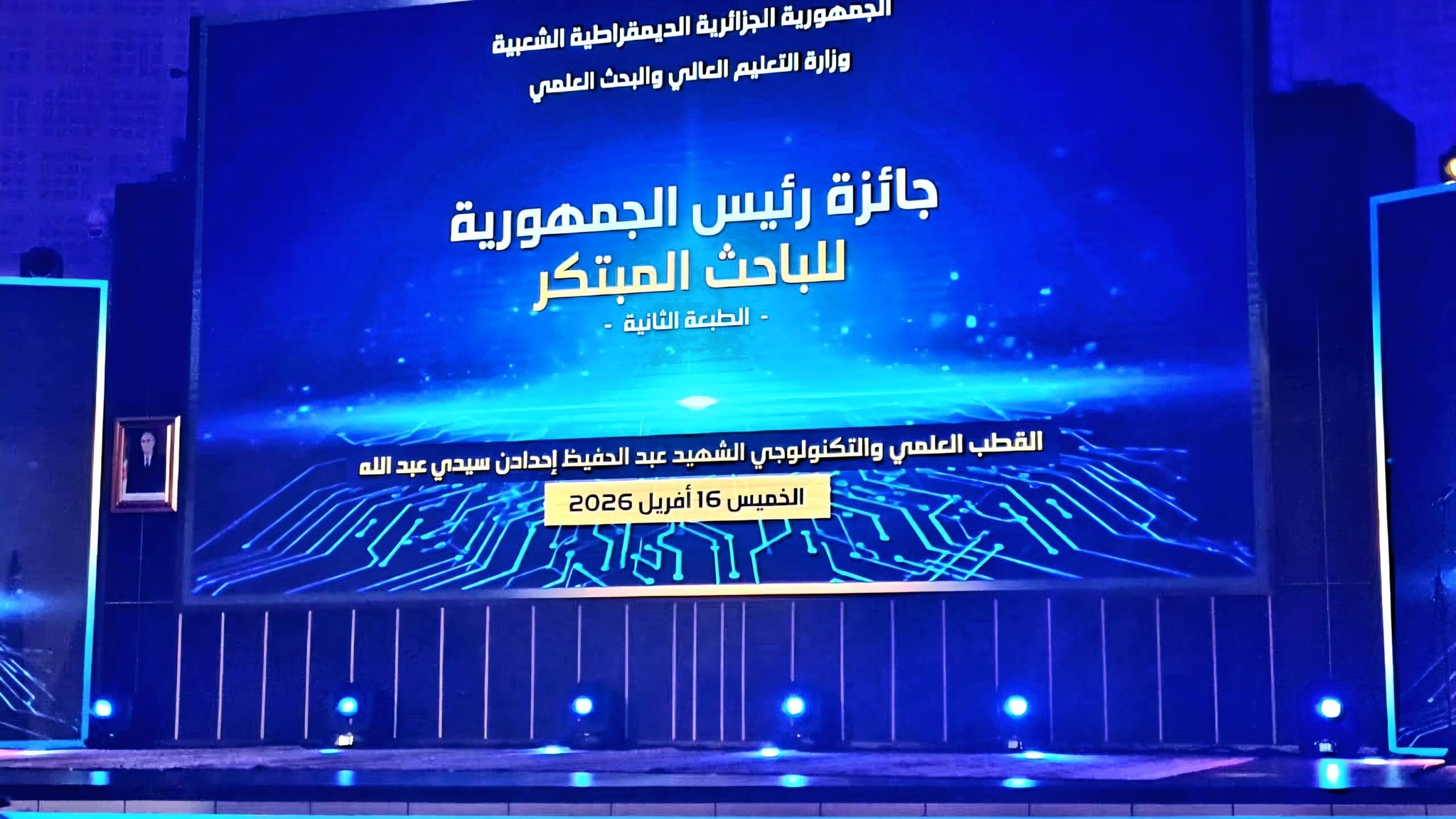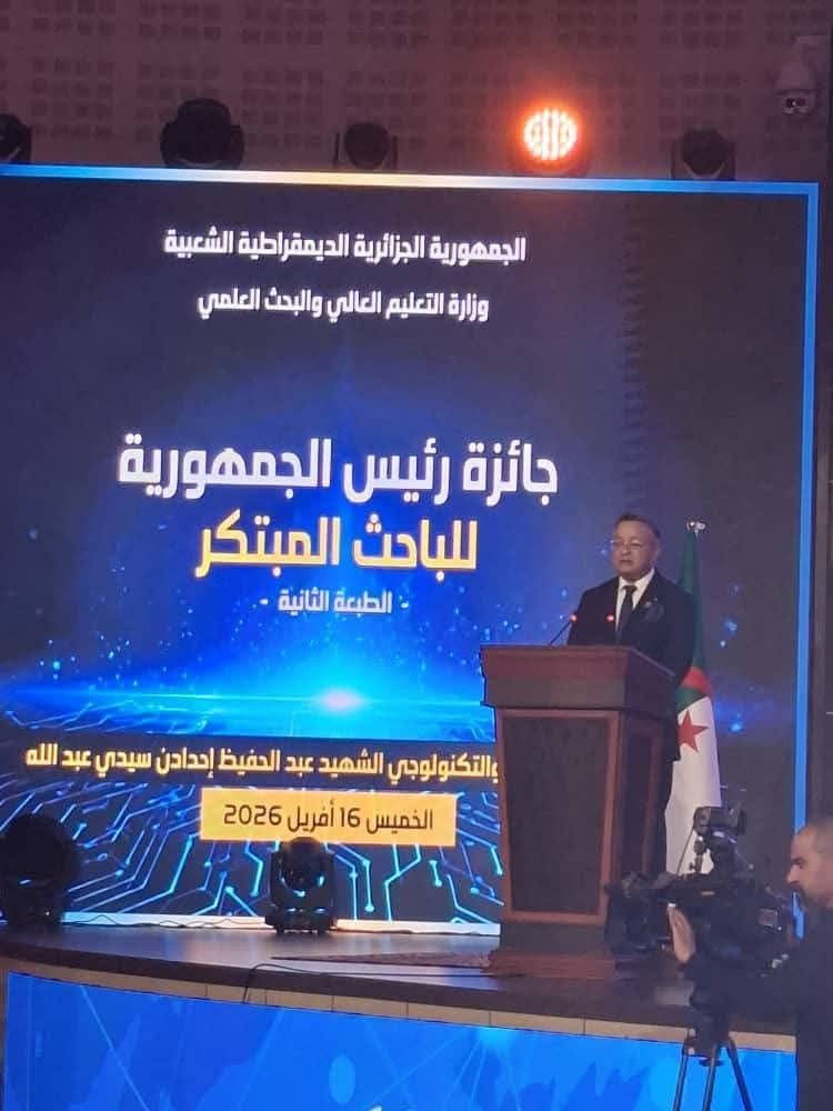 مشاركة السيد مدير الجامعة البروفيسور محمود دبابش في فعاليات جائزة رئيس الجمهورية للباحث المبتكر (الطبعة الثانية)، المنظمة من طرف وزارة التعليم العالي والبحث العلمي، وذلك صبيحة اليوم الخميس 16 أفريل 2026، تحت الرعاية السامية للسيد رئيس الجمهورية، بالقطب العلمي والتكنولوجي الشهيد عبد الحفيظ إحدادن – سيدي عبد الله.
